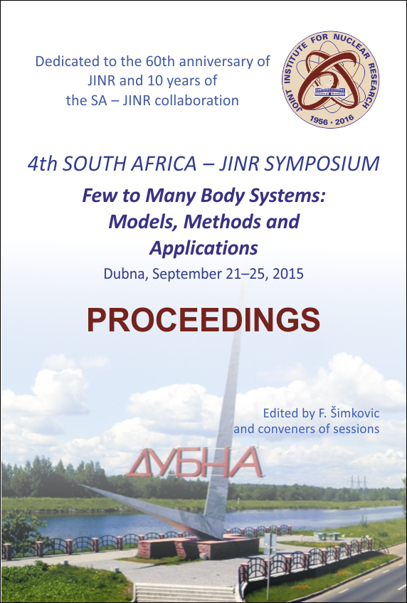 Proceedings of the 4th South Africa–JINR Symposium Edited by F. Simkovic and conveners of sessions The 4th South Africa–JINR Symposium “Few to Many Body Systems: Models, Methods and Applications” was organized by the Bogoliubov Laboratory of Theoretical Physics of the Joint Institute for Nuclear Research in the period September 21–25, 2015. It was dedicated to the celebration of the 60th anniversary of the JINR and 10th anniversary of signing the Memorandum of Understanding between the Government of the Republic of South Africa and the Joint Institute for Nuclear Research. The Symposium discussed the scope, success and perspectives of experimental, theoretical and applied physics at the JINR and in South Africa institutions. Special attention was devoted to scientific facilities on both sides. The goal of the meeting was to present main results of the SA–JINR collaboration, to extend the scientific and technological cooperation among the JINR and South Africa institutions, and to attract young scientists from both sides to running joint research projects. The Symposium program covered new developments in the field of particle physics, nuclear physics, applied nuclear physics, condensed matter physics, bio-monitoring project and physics of underground laboratories. The Symposium initiated opportunities to establish new areas of scientific cooperation and to extend the existing cooperation among physicists from South Africa and the JINR. The financial support was provided by the Joint Institute for Nuclear Research and the National Research Foundation of South Africa. Dubna: JINR, 2016. — 266 p.; [2] p. photos.